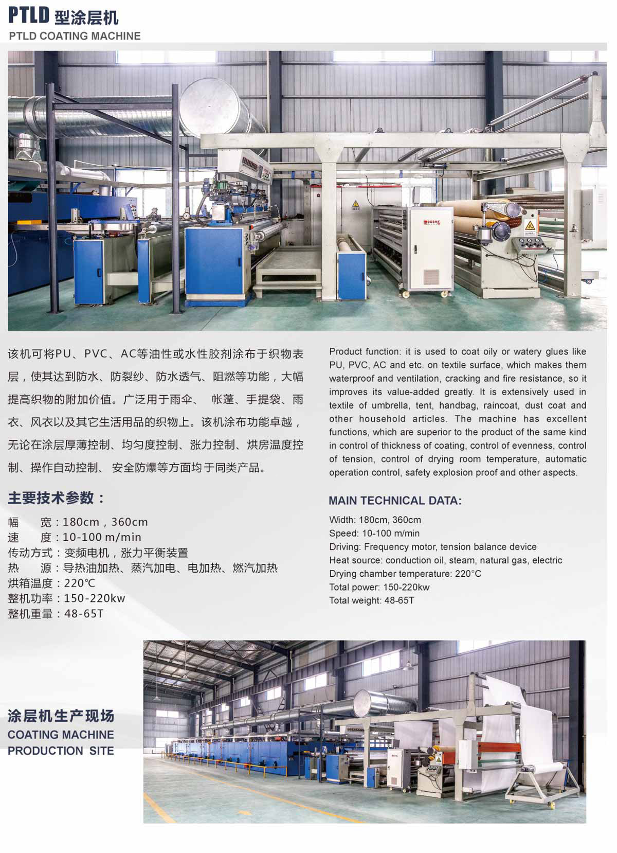 该机可将PU、PVC、AC等油性或水性胶剂涂布于织物表层,使其达到防水、防裂纱、防水透气、阻燃等功能,大幅提高织物的附加价值。广泛用于雨伞、帐篷、手提袋、雨衣、风衣以及其它生活用品的织物上。该机涂布功能卓越,无论在涂层厚薄控制、均匀度控制、涨力控制、烘房温度控制、操作自动控制、安全防爆等方面均优于同类产品。