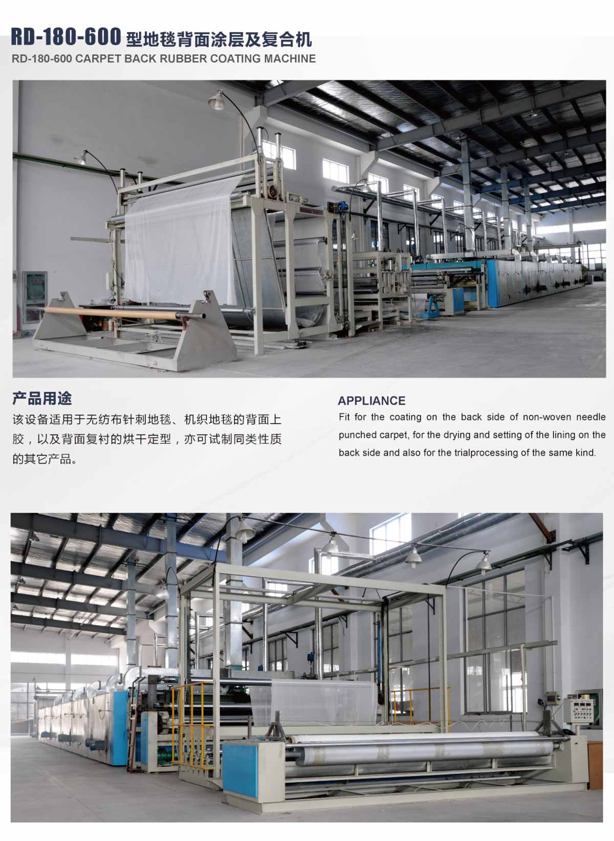 该设备适用于无纺布针刺地毯、机织地毯的背面上胶,以及背面复衬的烘干定型,亦可试制同类性质的其它产品。